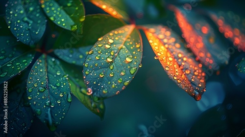 Water droplets glisten on green leaves after a refreshing rain shower.