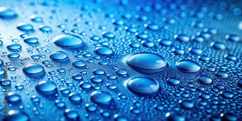 Water droplets glistening on a vibrant blue surface, water, drops, blue, reflective, surface, liquid, clear, freshness