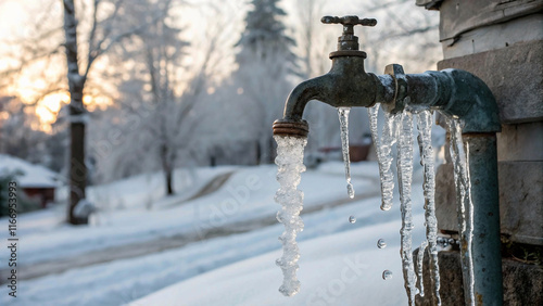 water flowing from a faucet frozen in time.Suspended in Time: Water Freezing Mid-Flow from an Outdoor Faucet on a Frosty Winter Day