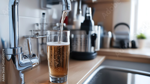 Water flows from a chrome faucet into a clear glass, filling it with liquid in a bright kitchen. Bubbles and modern appliances surround the focal point.