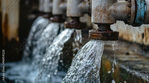 Water flows from rusty pipes. This photo illustrates the importance of water as a resource and the need to conserve it.