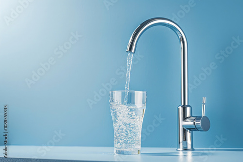 water from a tap is drawn into a transparent glass on a blue background, empty space for text, for a banner