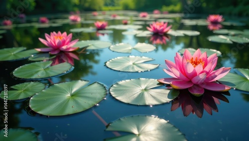 Water lilies create a vibrant floral pattern across a still lake, sun, flowers