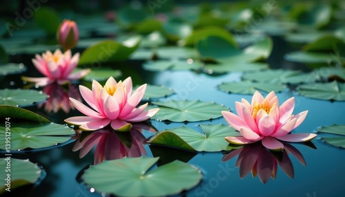 Water lilies create floral pattern on still lake, image, organic, aesthetic