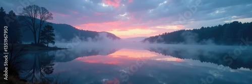 Water reflected in a misty lake on a cloudy evening, peaceful, serene