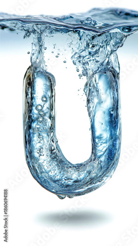 Water streams in an 'U' shape, bubbles trapped within, surface tension visible against a white backdrop, emphasizing motion & purity.