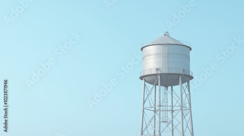 water tower, blue skies, industrial design, midday, water supply, landscape, architecture, community, utility, steel, tank, maintenance, engineering, storage, environment, simplicity, construction, local landmark, service, artistry