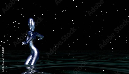 whimsical, rendering, naked, woman, girl, water, star, night, ocean, lake, river, chrome, mirror, silver, odd, weird