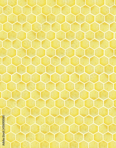 Watercolor abstract geometric pattern with honeycomb. Watercolor yellow hexagon with texture of stain, spray, splash and spot, fashion elements