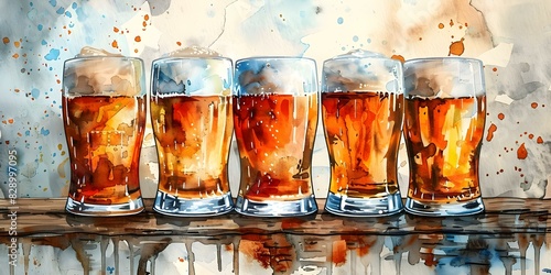 Watercolor art featuring intricately hand-drawn glasses brimming with tasty beer. Concept Watercolor Art, Hand-drawn Illustration, Beer Glasses, Intricate Details, Tasty Beverages