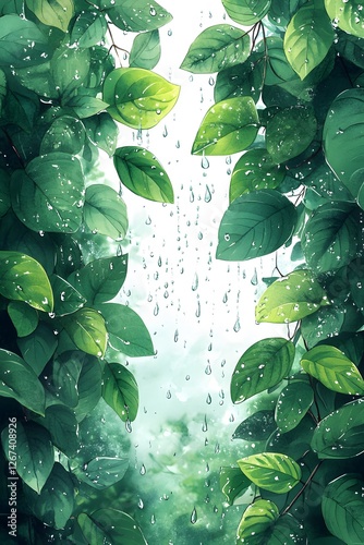 Watercolor artwork of rainwater falling onto lush green plants, showing nature's cycle with copy space