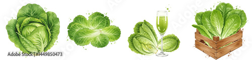 transparent, cabbage, lettuce, vegetable, food, fresh, green, healthy, organic, salad, diet, nourishment, vegetarian, raw, ingredient, leaf, produce, garden, agriculture, market, farm, wooden, crate, glasses, juice, drink, beverage, liquid, refreshment, still, life, arrangement, composition, horizontal, view, isolated, background, nature, plant, close, up, detail, grocery