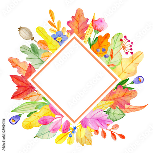 flower, floral, fall, autumn, plant, nature, green, watercolor, leaf, garden, forest, tree, tree branch, botanical, background, banner, card, design, decorative, hand-drawn, paint, flat, trendy, oak, pink, yellow, red, orange, bloom, blossom, white, template, season, herbal, poppy, illustration, frame, label