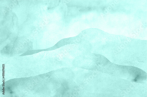 Watercolor background, mountains and sky hills, green, light green, herba turquoise, color transition, landscape
