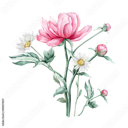 Watercolor bouquet of delicate pink peony and chamomile flowers in full bloom. Hand drawn illustration beautiful floral flowers daisy. Summer botanical plant on isolated. Elements for design