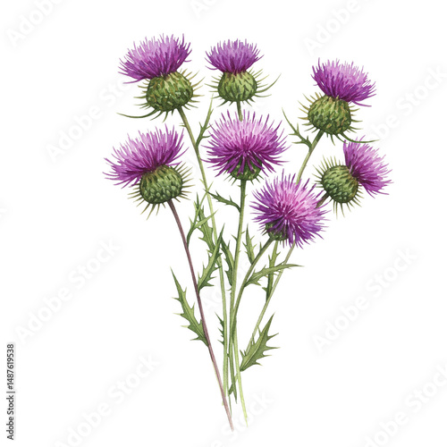 thistle, watercolor, illustration, botanical, plant, flower, nature, floral, drawing, painting, purple, green, spikey, wild, wild plant, garden, design, decorative, artistic, hand-painted