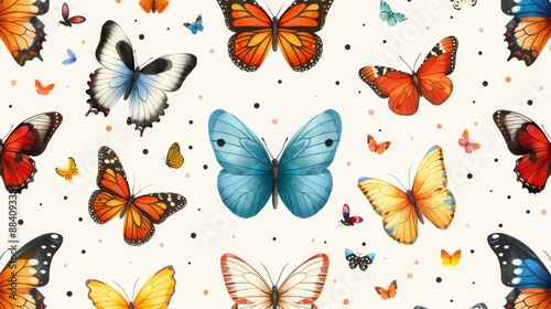 Watercolor Butterflies Seamless Pattern with Polka Dots