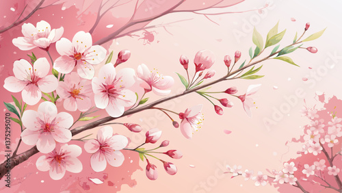 "Watercolor Cherry Blossom Background – Delicate Pink & White Floral Design for Spring with Copy Space"