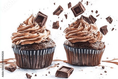 Watercolor Chocolate Cupcakes Explosion - Delicious chocolate cupcakes with rich frosting, exploding with chocolate pieces. Symbolizing indulgence, sweetness, celebration, joy, and decadence