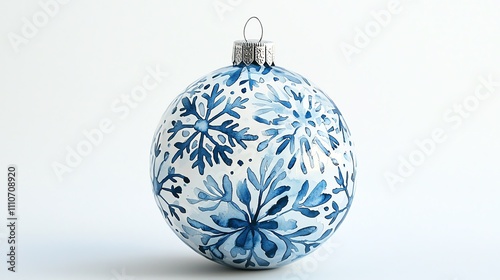 Watercolor Christmas bauble with intricate snowflake patterns, painted in soft blues and whites on white
