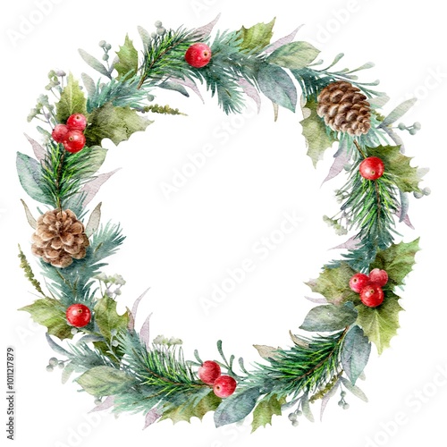 Watercolor Christmas fir wreath with red berries, fir cones, green mistletoe leaves, herbs.