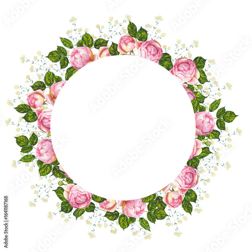 Watercolor circular frame made of pink peony roses and green leaves, ideal for wedding invitations, greeting cards, or elegant floral branding with space for text in the center.