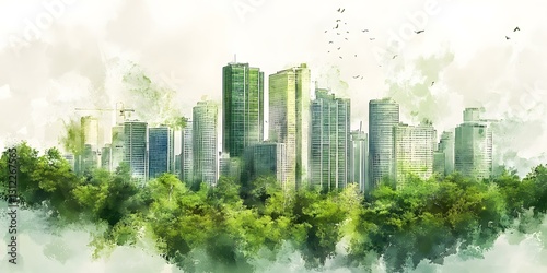 city landscape, watercolor, painting, urban, nature, green, tree, harmony, building, tower, city, environment, landscape, artistic, modern, design, illustration, art, architecture, skyscraper, leaf, foliage, park, sky, cloud, view, scenic, peaceful, tranquil, serene, fresh, vibrant, colours, blue, white, grey, abstract, style, creative, digital, image, artwork, visual, graphic