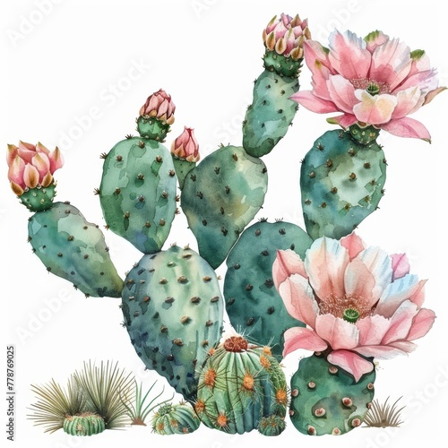 Watercolor clipart of a blooming cactus, desert summer on white background