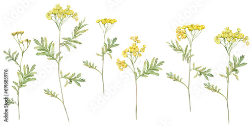 Watercolor common tansy. Set of yellow field flowers. Hand drawn illustration isolated on white background. Bundle botanical medicinal wildflowers clipart. Elements