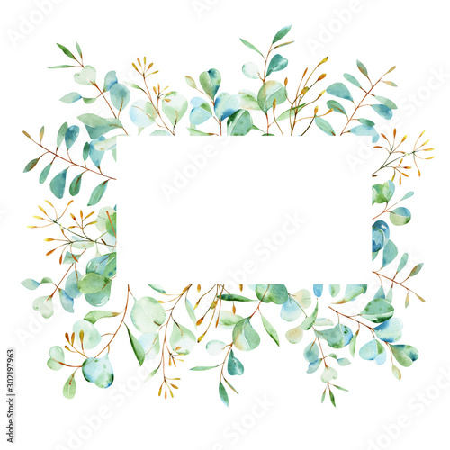 Watercolor eucalyptus wreath in blue and green colours. Silver dollar eucalyptus. Hand painted floral illustration with green leaves isolated on white background. For wedding, design or print.