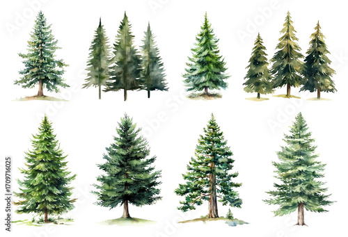 Watercolor evergreen tree illustrations.