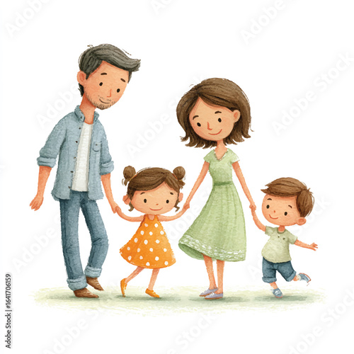 family, children, daughter, son, mother, father, holding, hand, walking, together, happy, illustration, watercolor, portrait, cartoon, art, drawing, childhood, parenthood, togetherness, love, care, bond