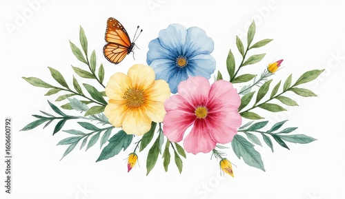 watercolor, floral, arrangement, butterfly, yellow, pink, blue, flower, green, leaf, monarch, botanical, spring, summer, nature, artwork, illustration, design, decorative, isolated, element, floral pattern, floral arrangement, painted, art, colourful, vibrant, blossom, bloom, foliage, tree branch, stem, flora, garden, wildflower, herb, plant, drawing, artistic, graphic, decoration, clip art, image, motif, pattern, white background