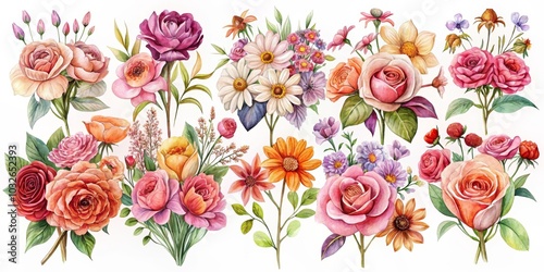 Watercolor Floral Bouquet of Roses and Wildflowers, floral , botanical