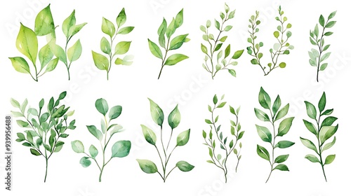 watercolor, floral, set, green, leaf, greenery, branch, twig, etc, cut, hand, drawn, illustration, white, background, watercolor, clip art, drawing, plant, leaf, nature, flower, herb, spring, vector, rosemary, tree branch, growth, pattern, grass, decoration, tree, flora, foliage, summer, design, plant, food, spice, garden