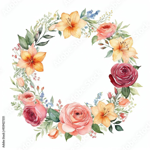 Watercolor floral wreath with lilies, roses, and green leaves on white background.