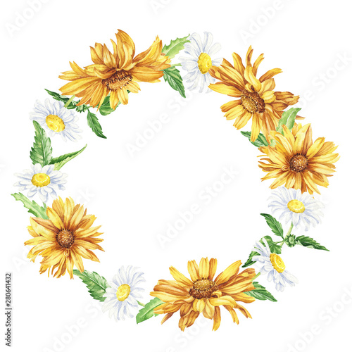 chaplet, frame, daisy, chamomile, watercolor, hand-drawn, watercolor, blossom, floral, background, nature, illustration, design, flower, decoration, art, summer, leaf, card, invitation, wedding, beautiful, decorative, garden, spring, graphic, yellow, drawing, greeting, template