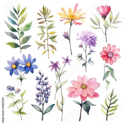 Watercolor flowers. Set Watercolor of multicolored colorful soft flowers. Flowers are isolated on a white background. Flowers pastel colors.