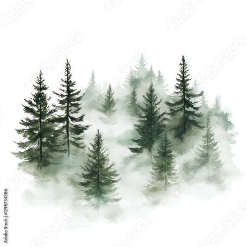 illustration, background, vegetation, watercolor, landscape, isolated, outdoors, painting, timberland, clip art, conifer, texture, vibrant, weather, forest, nature, serene, abies, colours, foggy, green, misty, paper, plant, tree, white, land, mist, pine, snow, fir, fog