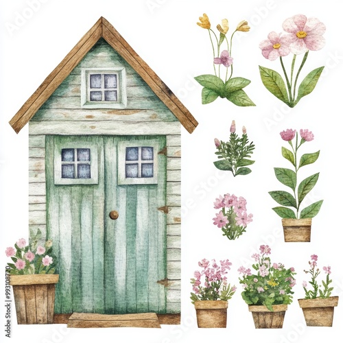 watercolor, garden, shed, bungalow, wooden, green, flower, plant, pot, pink, white, illustration, clip art, isolated, botanical, floral, design, element, spring, summer, nature, farmhouse, rustic, vintage, cute, romantic, whimsical, art, hand-painted, hand-drawn, digital, printable, clip art, graphic, scrapbook, bricolage, decoration, home decor, wallpaper, pattern, background, textile, fabric, stationery