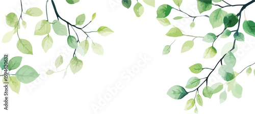 Watercolor Green Leaves and Branches Border on White Background for Design Element