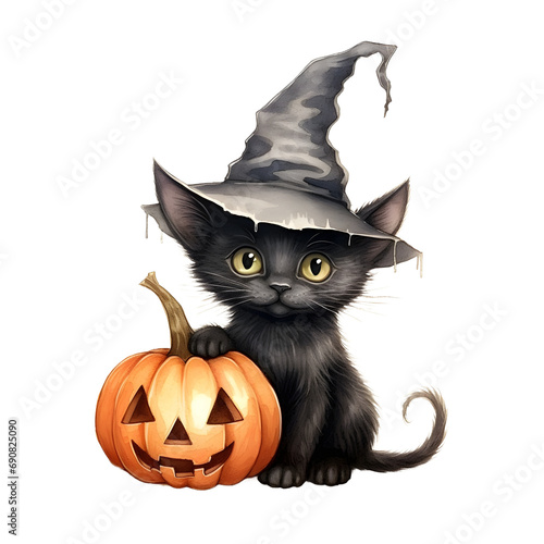 Watercolor halloween cute black cat in witch hat with pumpkin jack-o-lantern on transparency background