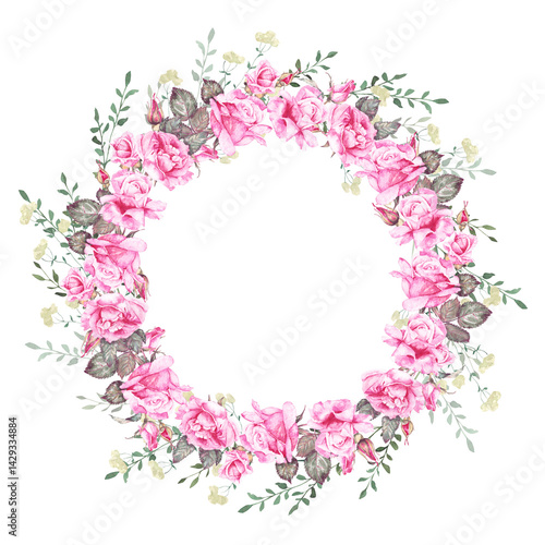 Watercolor hand drawn illustration of a wreath of flowers. Wreath of watercolor roses. Decor for wedding, birthday, children's party and seasonal holidays.