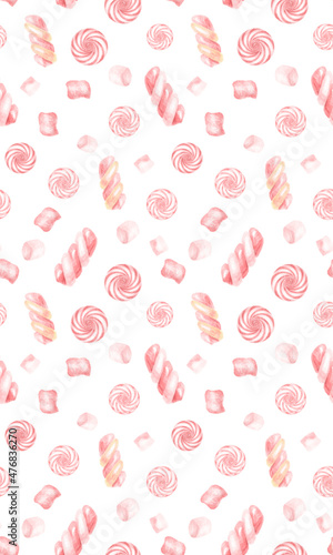 Watercolor hand drawn pink and gold sugary seamless pattern with elements for Valentine's day. Striped sweets, candy, lollipops, marshmallow isolated on white background.