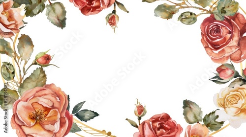 Watercolor hand painted floral wreath with gold frame border leaves flowers and space for text Collection of rose bouquets White background