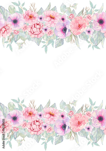 Watercolor hand painted flower pink anemone and peony invitation card isolated on white background