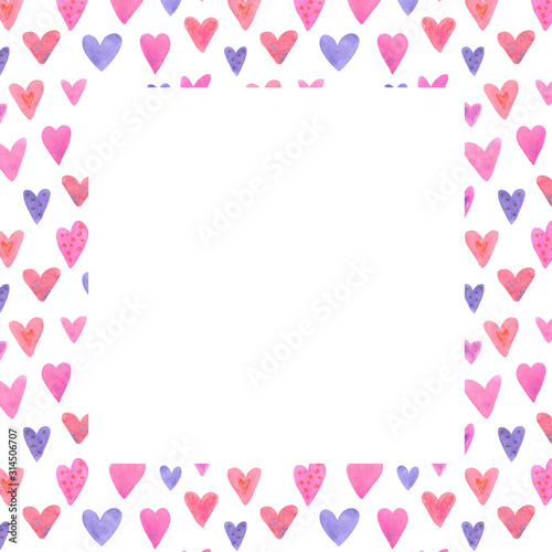 Watercolor hearts frame. Square Valentine's day frame. Watercolor hearts hend drawn illustration.