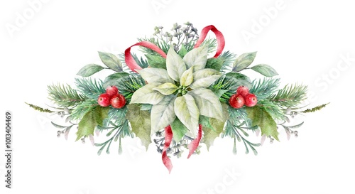 Watercolor horizontal garland with white poinsettia, red berries, fir branches and red bow. Christmas decorative element.