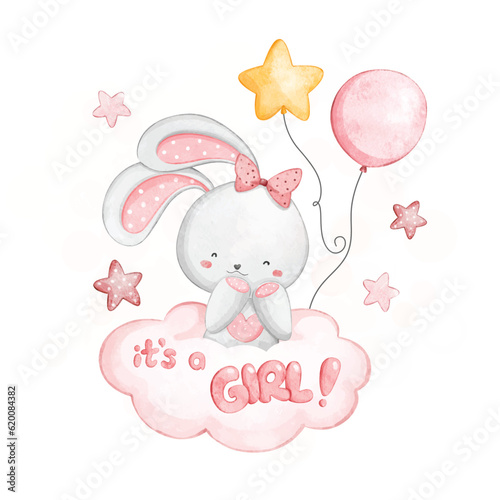 animal, baby, baby girl, pink, rabbit, rabbit, baby shower, watercolor, cartoon, illustration, cute, balloon, card, greeting, design, vector, drawing, hand-drawn