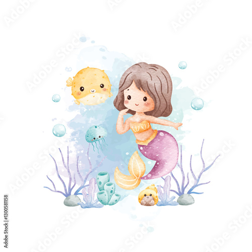 Watercolor Illustration Cute Mermaid and Pufferfish